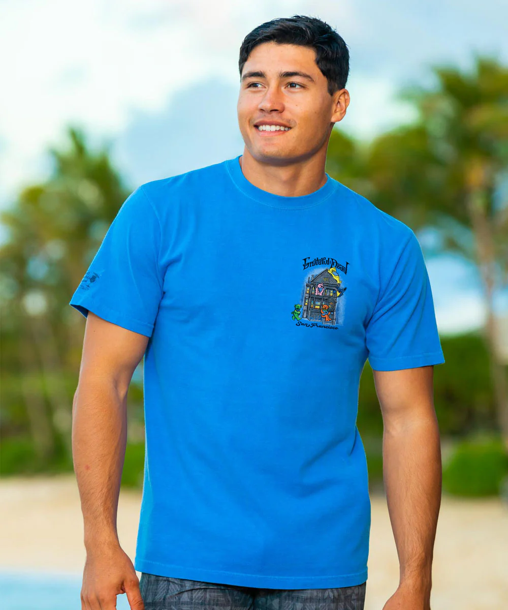 Visiting 710 Ashbury Street in San Francisco's Haight-Ashbury neighborhood is a must-do pilgrimage for any true Dead Head. But whether you've been there or not, you'll feel at home in this Dancing Bears tee that honors the Grateful Dead's old house where their long, strange trip began. Made using our exclusive specialty dyeing process that uses real blue curacao liqueur and featuring 100% combed ring-spun cotton, this t-shirt has 50+ SPF protection to keep you feeling cool, calm and protected all year long. We only use environmentally friendly water-based inks that penetrate the material's fiber resulting in more vibrant colors, softer feel and artwork that doesn't crack or peel. Plus, it is proudly printed in the United States for quality you can see and designs that stand the test of time.