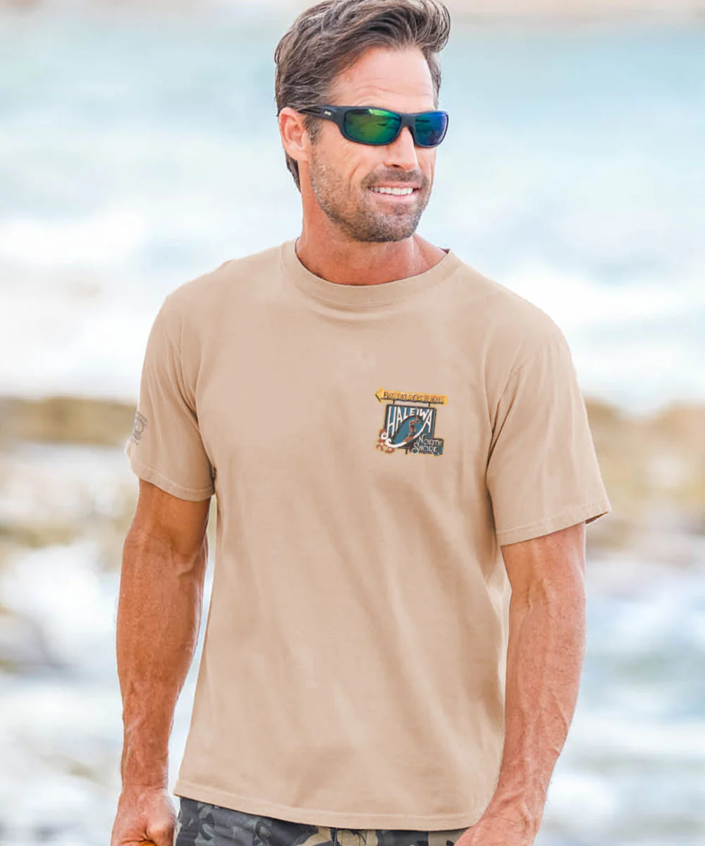 Since 1996, the now famous Haleiwa sign has been welcoming all to the North Shore and everything it has to offer. Everyone who comes here has to take a picture with the sign but we're pretty sure getting one of these t-shirts is going to be the new tradition for all North Shore visitors. Made using our exclusive Kona coffee specialty dyeing process and featuring 100% combed ring-spun cotton, this t-shirt has 50+ SPF protection to keep you feeling cool, calm and protected all year long. We only use environmentally friendly, water-based inks that penetrate the material's fiber resulting in more vibrant colors, softer feel and artwork that doesn't crack or peel. Plus, it is proudly printed in the United States for quality you can see and designs that stand the test of time.