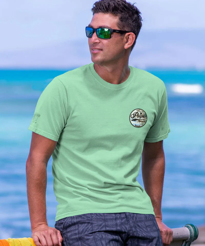 Where palm trees sway and waves kiss the shore, Poipu is the south shore’s sun-soaked gem. Gentle waters, golden sand, and aloha that lingers long after sunset. Made using our exclusive specialty dyeing process that uses real key limes and featuring 100% combed ring-spun cotton, this t-shirt has 50+ SPF protection to keep you feeling cool, calm and protected all year long. We only use environmentally friendly water-based inks that penetrate the material’s fiber resulting in more vibrant colors, softer feel and artwork that doesn’t crack or peel. Plus, it is proudly printed in the United States for quality you can see and designs that stand the test of time.