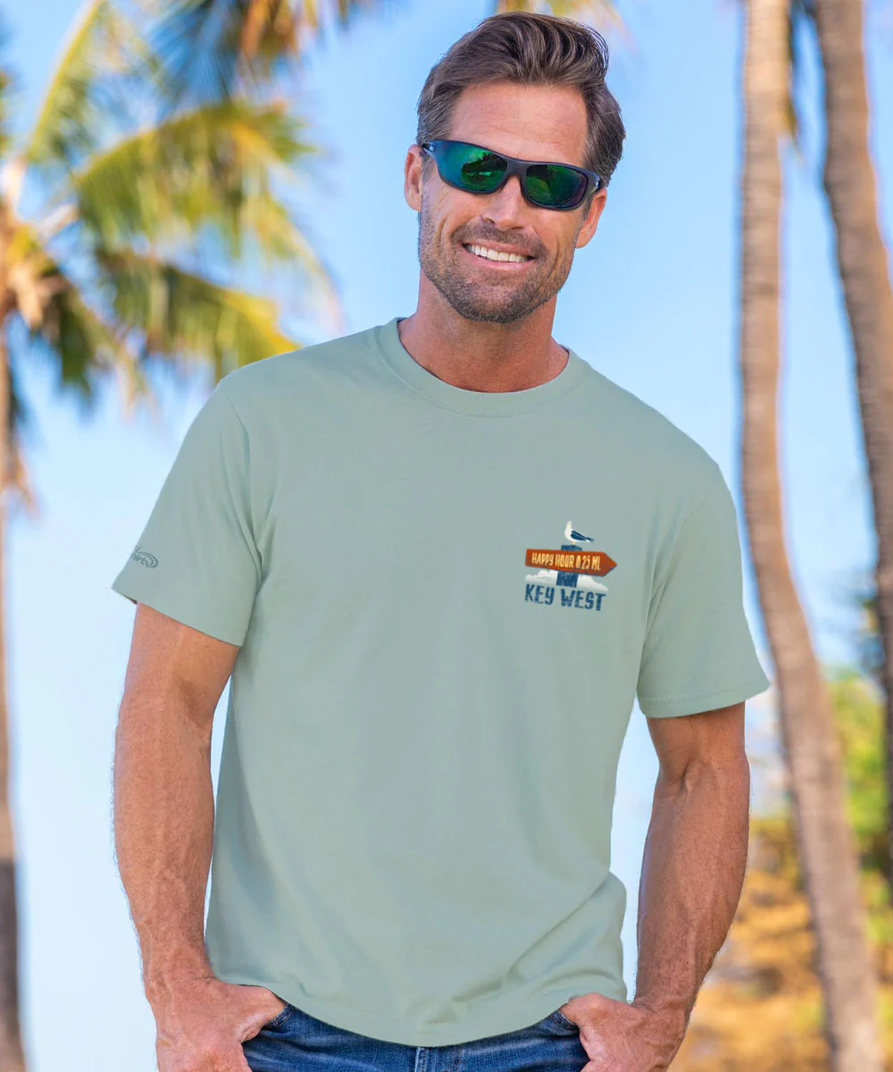 In Key West, it’s not about how far you’ve come - it’s about how close you are to your next cold one. This colorful signpost tee points you in the right direction: straight to happy hour. Made from 100% cotton that is ring spun then combed to remove impurities, this fabric is luxuriously soft and lightweight yet incredibly strong. We only use environmentally friendly water-based inks that penetrate the material's fiber resulting in more vibrant colors, softer feel and artwork that doesn't crack or peel. Plus, it is proudly printed in the United States for quality you can see and designs that stand the test of time.