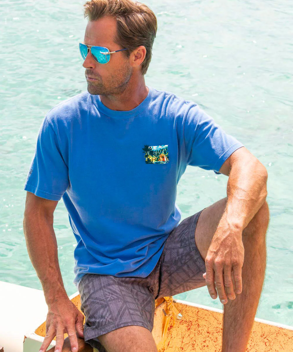 When you 're out for a sail on Hawaii's tropical waters you can experience adventure and relaxation all at the same time. Let both feelings wash over you in this chill and charming Blue Hawaii dyed tee. Made using our exclusive specialty dyeing process that uses real blue curacao liqueur and featuring 100% combed ring-spun cotton, this t-shirt has 50+ SPF protection to keep you feeling cool, calm and protected all year long. We only use environmentally friendly, water-based inks that penetrate the material’s fiber resulting in more vibrant colors, softer feel and artwork that doesn’t crack or peel. Plus, it is proudly printed in the United States for quality you can see and designs that stand the test of time.