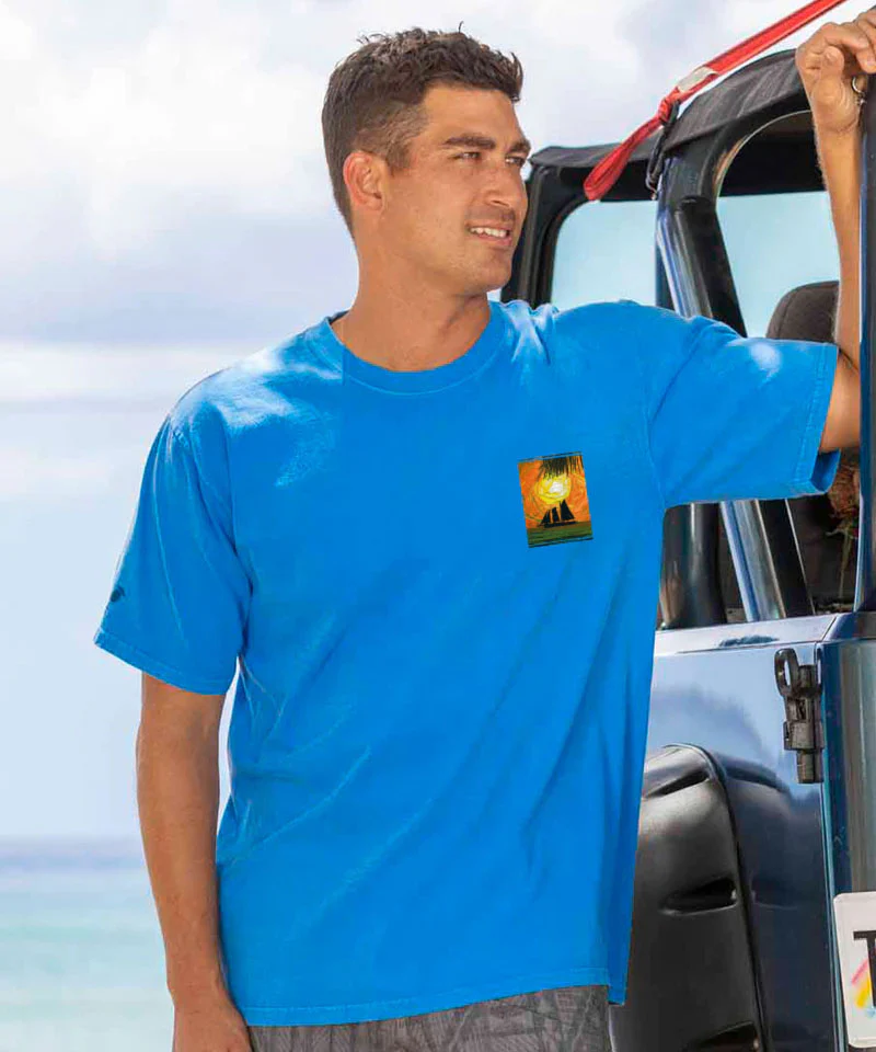 Golden light swirls through the sky as the sun dips low over Key West, casting a dreamy glow across Mallory Square. Silhouettes of swaying palms and a lone sailboat drift into view, capturing the calm magic of a sunset you never want to end. Made using our exclusive Blue Hawaii specialty dying process and featuring 100% combed ring-spun cotton, this t-shirt has 50+ SPF protection to keep you feeling cool, calm and protected all year long. We only use environmentally friendly water-based inks that penetrate the material's fiber resulting in more vibrant colors, softer feel and artwork that doesn't crack or peel. Plus, it is proudly printed in the United States for quality you can see and designs that stand the test of time.